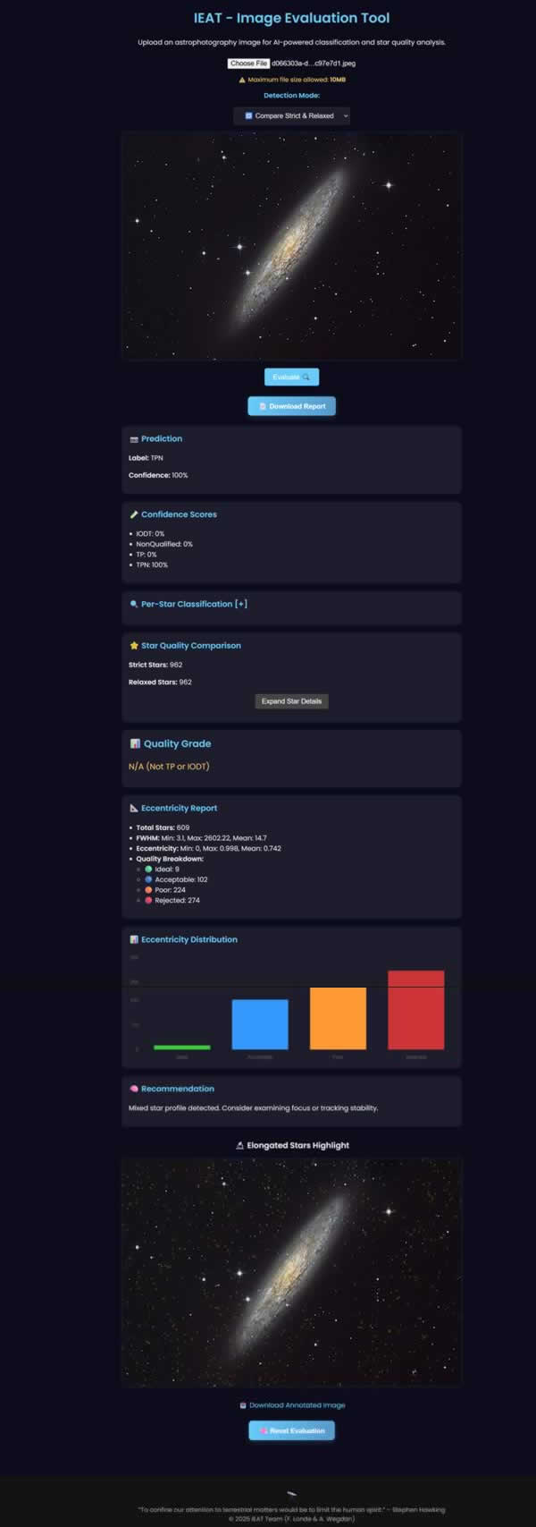IEAT - Image Evaluation AI Tool, is an AI-powered astrophotography evaluator, born to from a shared vision by Ahmed Wegdan (Xee) and myself. An AI that evaluates your images based on the popular Astrobin.com rules for the Image of the Day (IOTD) without any human bias. It ranks images into four categories: